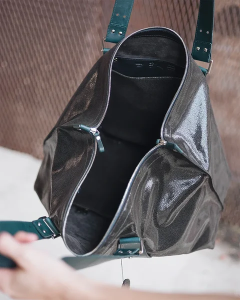 Secured by a metal zipper, the bag opens wide, revealing a flat, sturdy base and soft sides. This puts your belongings within easy reach. Inside has strong pocket to keep smaller items safe and accessible.